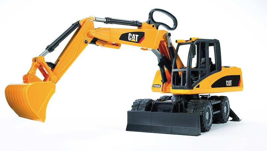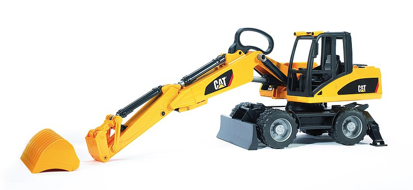 This Caterpillar Excavator is wheeled for use on concrete or asphalt! Realistic details include sculpted rubber wheels, an easy-to-use shovel arm with removable bucket that is operated with a handle, a cab that rotates 360 and a hood that opens to reveal the ventilator grill.