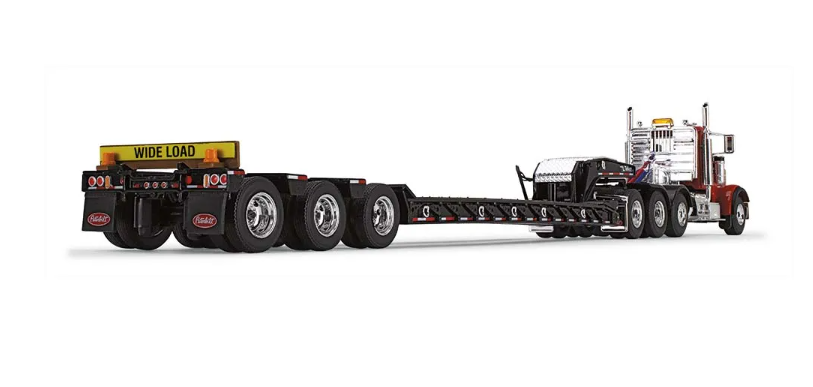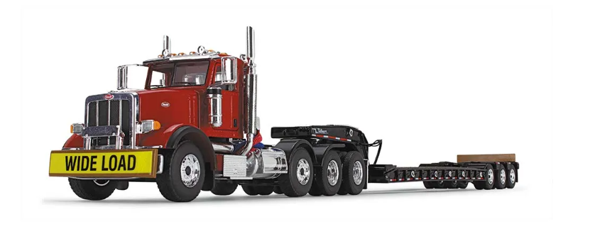 This authentic Peterbilt® Model 367 Tri-Axle Day Cab diecast metal replica model comes paired with a Talbert® 55SA Tri-Axle Lowboy Trailer and features an opening hood with authentic engine detail, opening doors with accurately detailed cab interior, pivoting fifth-wheel for trailer attachment, detailed chassis and undercarriage. This quality replica is decorated with a red and black paint scheme